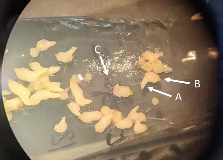 A few weeks after sowing, germination is evident. The orchid seedlings grow into a structure called a protocorm with shoot (A) and root (B) tips and rhizoids (C) (below). The shoot and root tips will grow into the respective above- and below-ground structures of a mature orchid, while the hair-like rhizoids aid the developing seedling in anchoring itself to the growing medium and uptaking water and nutrients.