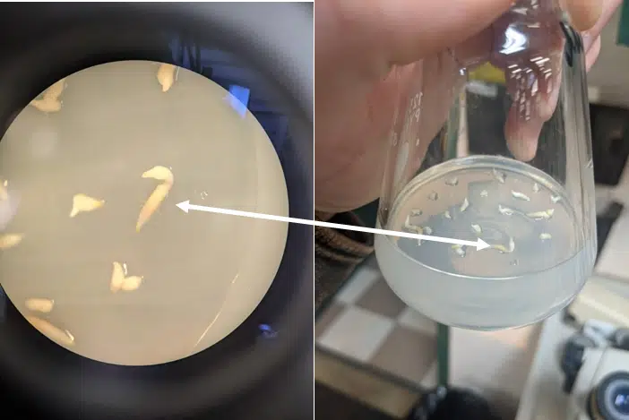 The first step after sowing the seeds was to place them in darkness (i.e. a filing cabinet outside Research Scientist Na Wei’s office) for several weeks. One week after sowing we checked for contamination – the germination environment should be kept free of microbes (mostly bacteria and fungi). When sowing the seeds, we work under a laminar flow hood that reduces particles in the air, and we sterilize our tools before use. The challenge is that it is impossible to see these microbes with the naked eye, and any contaminants will take over the culture tube if given time to incubate (see the unknown contaminants on the right). We think the COVID-19 mask precautions may have improved our sterile technique by reducing the risk of contamination from our breath.