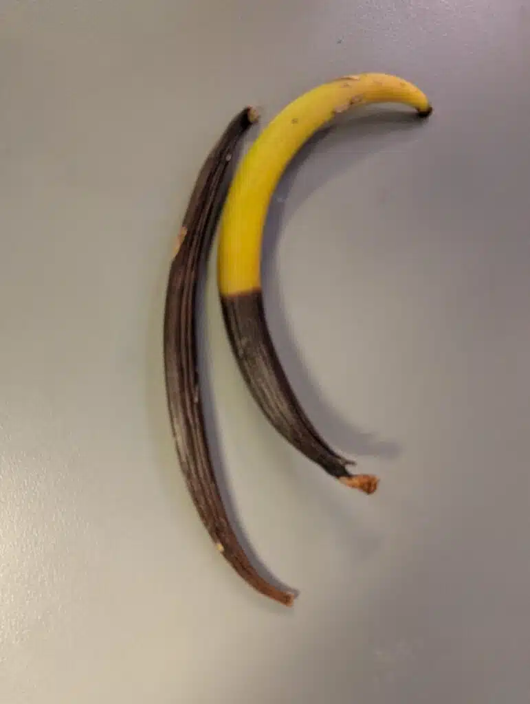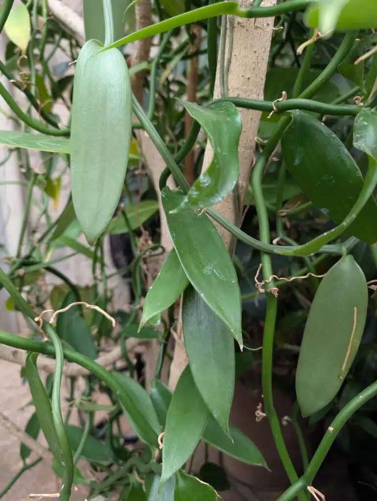 Pollination of these orchids is a delicate task. First, I must check for flowers every day and pollinate early in the morning, as this was when flowers freshest and hand pollination is most likely to be successful. To pollinate, I tear back the petals to get a good look at the reproductive portion of the flower. Within the flower, there are the anthers which have pollen. This is the male portion of the flower. There are also the stigmata, which is the female portion of the flower. My job as hand pollinator is to get the pollen from the anthers to the stigmata. The tricky part about vanilla orchids is a protrusion in the bloom separating the anthers and stigmata called a rostellum. In nature, the rostellum prevents self-pollination, so the Melipona bee would visit one vanilla flower after another, transporting pollen from the anthers of one bloom to the stigmata of another. For hand pollination though, the rostellum is in my way. I use a small pointed wooden stake to gently push up the rostellum, which will flatten into place behind the anthers. At this point, I gently squeeze the anthers against the rostellum flattened behind it to secure everything in the new position. This is a delicate process and with too light a touch and rostellum doesn’t stay put, but too heavy a touch and the anthers are squeezed to bits. But with just the right pressure the rostellum no longer separates the anthers and stigmata allowing the pollen to transfer. Then, if pollination is successful, after about a week, the ovary, which is located directly behind the flower itself, will begin to swell. Over time, it will grow into a vanilla bean.