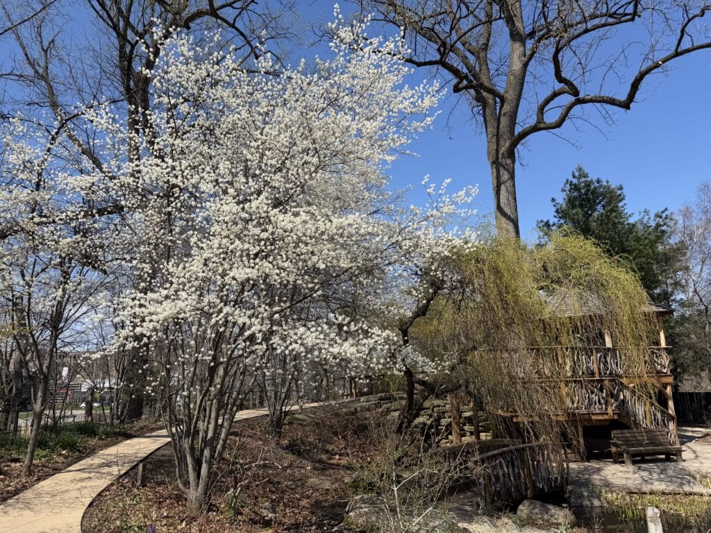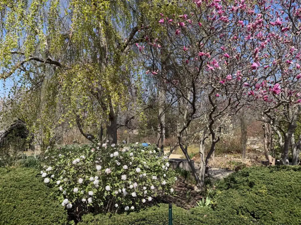 At the Botanical Garden, woody plants like Korean spice viburnum and serviceberries are in full bloom.