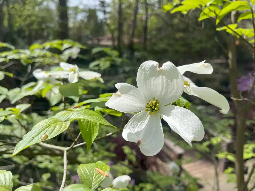 At the garden, flowering dogwood (Cornus florida) is just coming into bloom. The large white “petals” are actually flower-like bracts that form below the cluster of tiny yellow flowers in the center of each inflorescence. Take a closer look to see if you can find any that have opened up.
