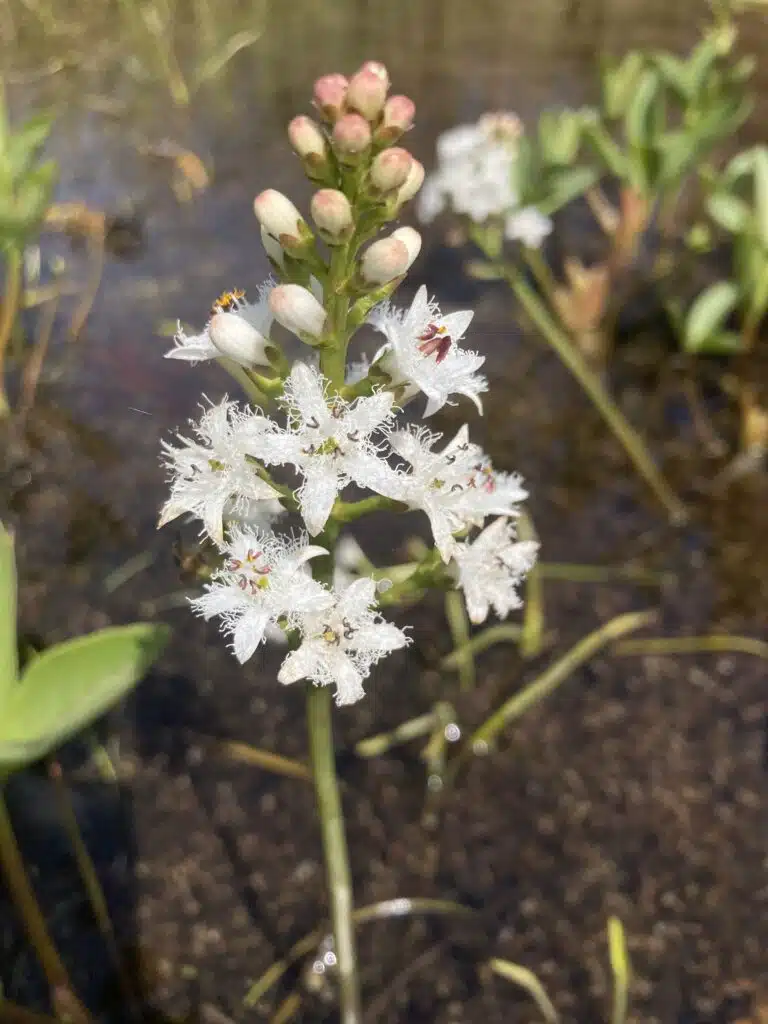 Bog buckbean (Menyanthes trifoliata) is a native aquatic plant that grows in shallow water along bog margins. These unique and beautiful wildflowers are not easily found in northeast Ohio, so make sure to seek them out while they’re still blooming in the wildflower garden.