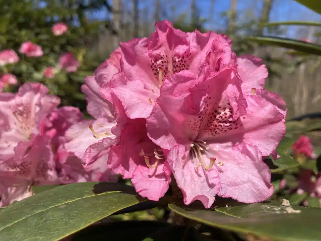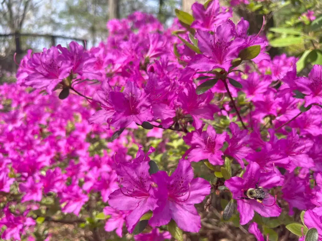 The stars of the garden this week are the azaleas blooming in the waterfall garden. The electric fuchsia flowers of Rhododendron ‘Herbert’ are so vibrant that they can hardly be captured by your phone’s camera—you have to see this one in person. If it’s a sunny day, you might even catch a bumblebee enjoying the bright blooms.
