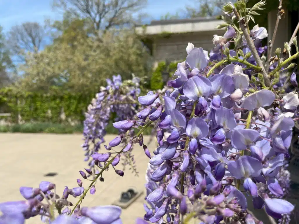 What’s that smell? It’s the Japanese wisteria, of course! These fragrant flowers will bloom sporadically all summer, but once their leaves unfurl, they will become concealed underneath the foliage. You can’t miss these plants as they flank the doors that open up to the terrace- catch them now while they are packed with lavender petals.