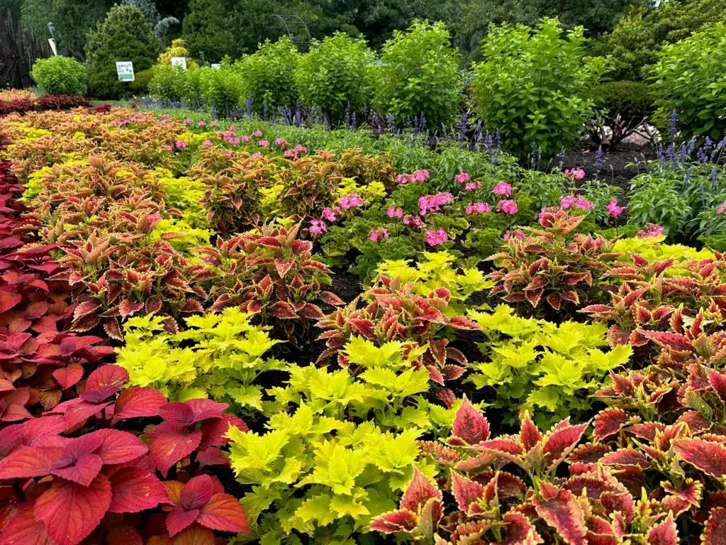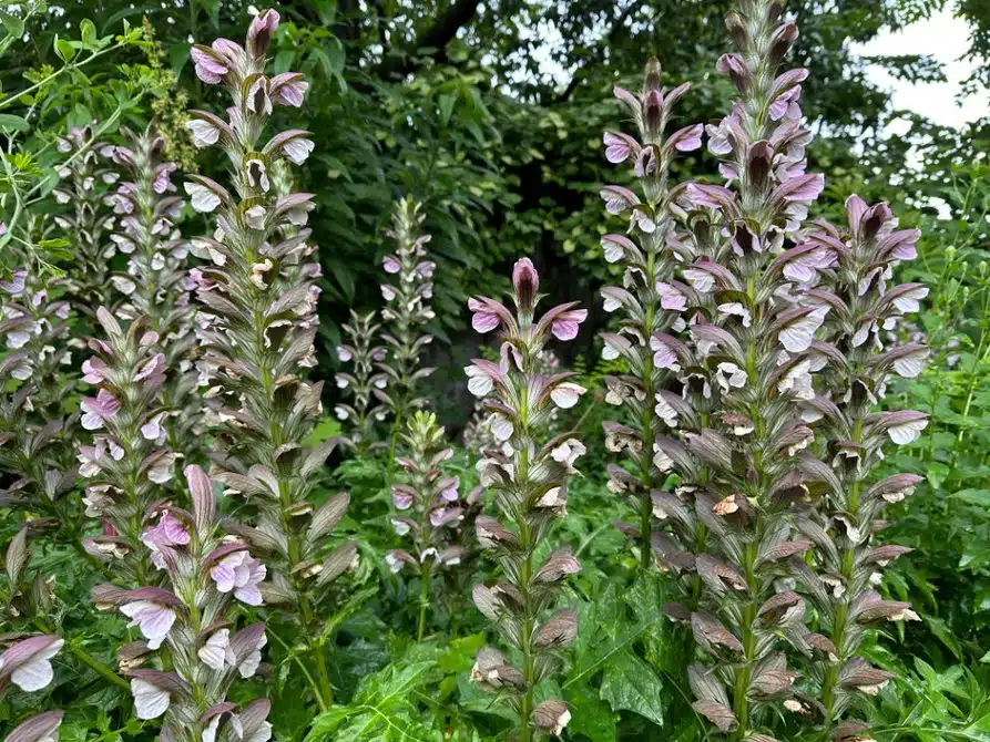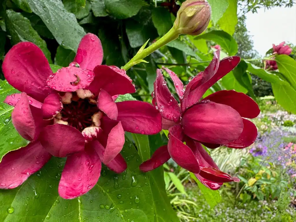 I had the fortune to meet Asia Armour this week, who has designed a wonderful “art in bloom” bed along the Allee adjacent to the Geis Terrace. Her choice of three Coleus, a pink geranium, and blue salvia simply glow on a rainy day. The plants are maturing and looking beautiful! A unique plant that many stop and ask us about that blooming right now bear’s breeches, Acanthus mollis. It looks a bit like a giant-flowered mint, but it’s not in the mint family, but in the closely related Acanthaceae. It and relatives are distributed around the Mediterranean region and further east into Asia. Finally, there’s a shrub in the Western Reserve Herb Society garden that is begging me to show you– it’s Calycanthus floridus ‘Aphrodite’, a cultivar of our native sweetshrub. While you must head to the southeast to find this long-blooming shrub in the wild, it’s been blooming for over a month at the garden.