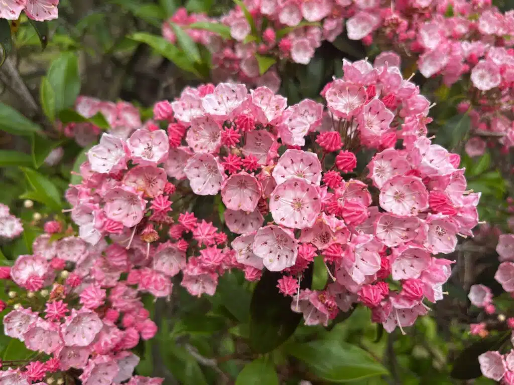 Take a moment to get closer—you will almost certainly catch a bumblebee buzzing among the flowers and climbing into the tube-shaped flowers for a sip of nectar. Moving to the Discovery Garden, look for the showy flowers of Phlox ‘Fashionably Early Crystal’ near the entrance and the incredible display of Oenothera fruticosa ‘Fireworks’ south of the pergola. Finally, continuing on toward the Helen S. Layer Rhododendron Garden, you will get the chance to see the incredible and complex flowers of Kalmia latifolia ‘Ostbo Red’ near the bridge next to Logsdon Pond. This incredible mature specimen was accessioned in 1975 and is a highlight of early June in the Rhododendron Gardens.