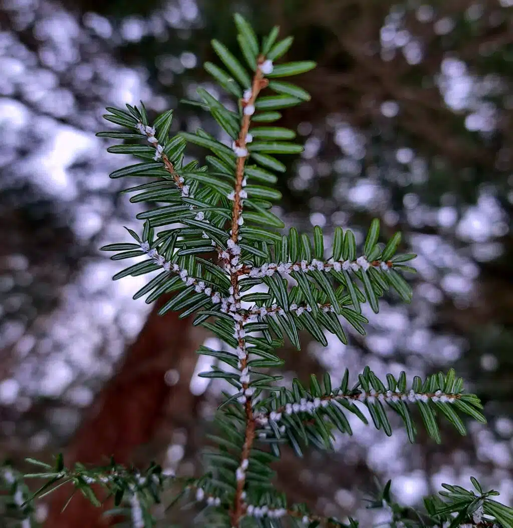 The hemlock woolly adelgid (HWA) is a tiny invasive insect that’s been found in some of Holden’s natural areas. The pest feeds on tree sap and can kill a hemlock in as little as four years, making early detection critical for protecting trees. In winter, the adelgid produces a characteristic white, woolly wax coating that protects it from extreme cold — and makes it much easier for scientists to spot.
