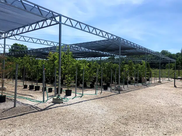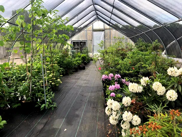 Rhododendrons blooming in our shade structure. The nursery is nestled in the middle of open fields, forest, and wetlands. It’s a beautiful place to work, especially this time of year.