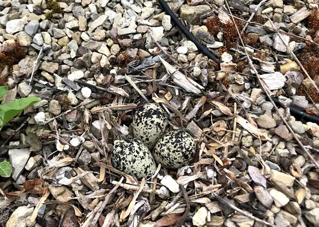 Can you spot the killdeer nest? It’s well camouflaged in the gravel floor in the tree container area.