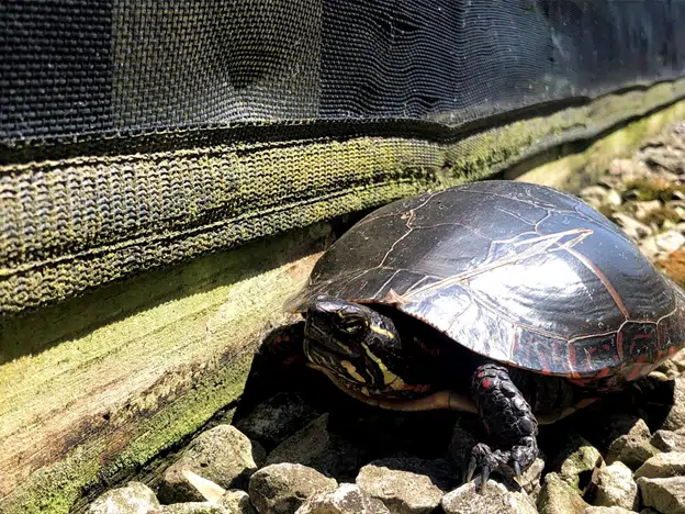 A painted turtle walks along the shade structure while making its way through the nursery.