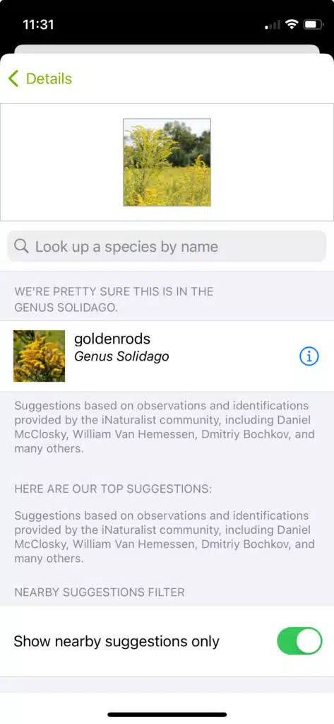 When you upload this photo as an observation on the app, you will be able to view suggestions for a species identification. In this case, the photo is not enough to ID the plant to species, but iNaturalist is able to suggest a genus: Solidago, the genus known as Goldenrod.