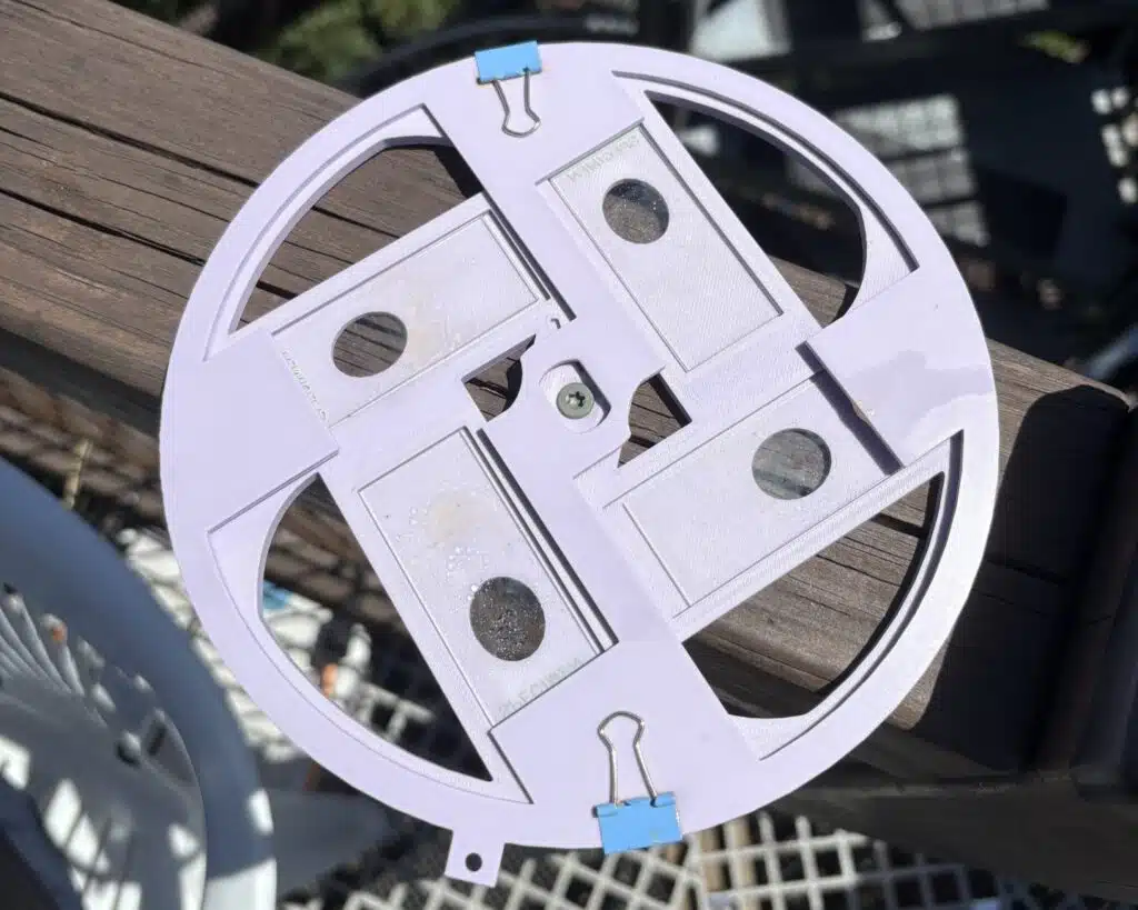 The disk itself is made of 3D-printed plastic, and it has four slots that hold microscope slides. Each slide is coated with petroleum jelly like you’d buy at the drug store. When tiny traces of organisms float by in the air, they stick to the jelly.