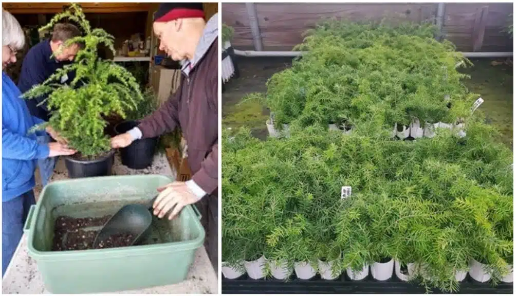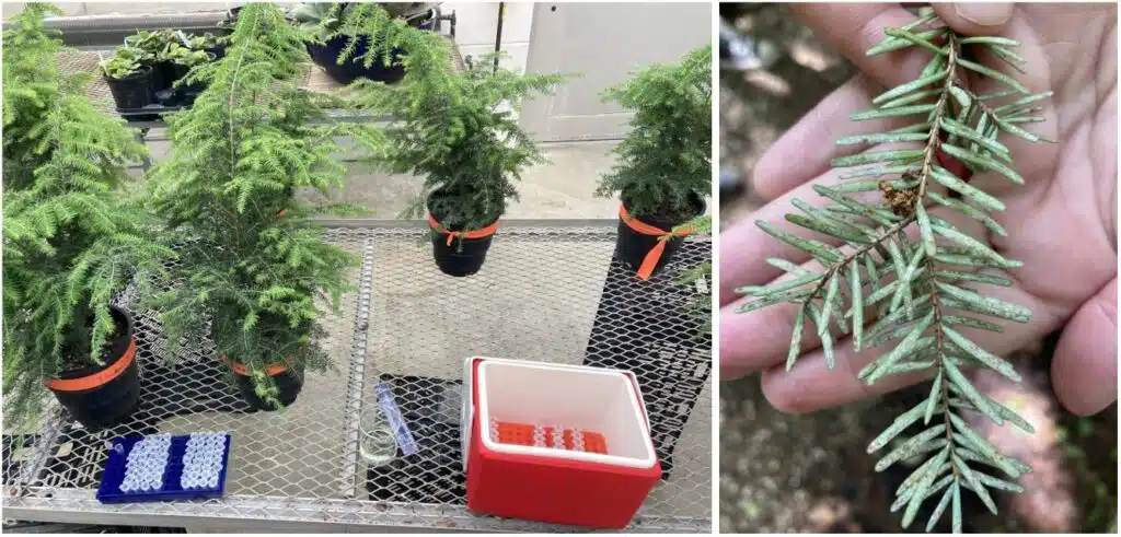 One major goal of the hemlock team at Holden is to develop better tools for studying and breeding resistant trees. They’re creating a new screening method to measure how well individual trees can fight off hemlock woolly adelgid (HWA), and crucially, whether that resistance comes from heritable genetic traits that can be passed down through breeding. The team is also experimenting with techniques to make trees flower and produce cones much earlier than normal — at just 2-5 years old instead of the typical 30 years. Speeding up this timeline will allow researchers to breed multiple generations much faster.